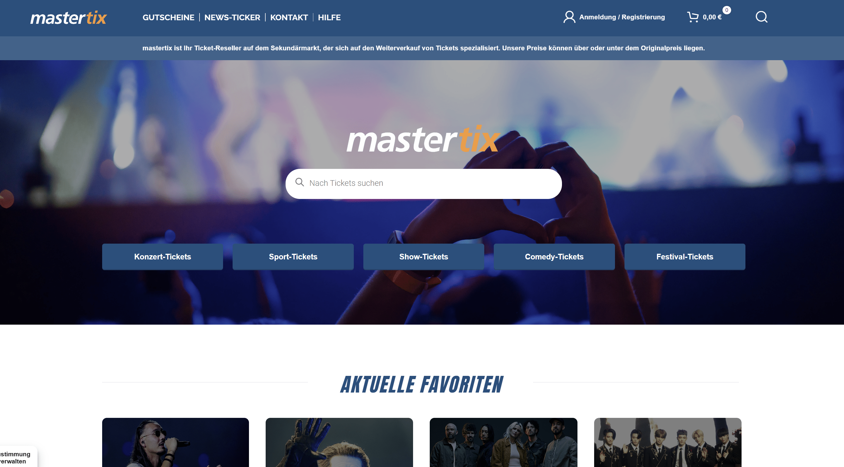 Für Mastertix wurde ein moderner und benutzerfreundlicher Ticket-Onlineshop entwickelt, der den Kauf von Tickets schnell und einfach macht.